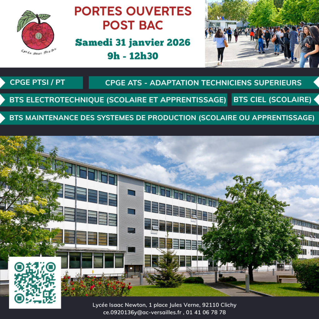 Les Portes Ouvertes Post Bac se tiendront le Samedi 31 janvier 2026 pour nos formations CPGE PTSI-PT et ATS, BTS CIEL, BTS Électrotechnique, BTS Maintenance des systèmes de production.